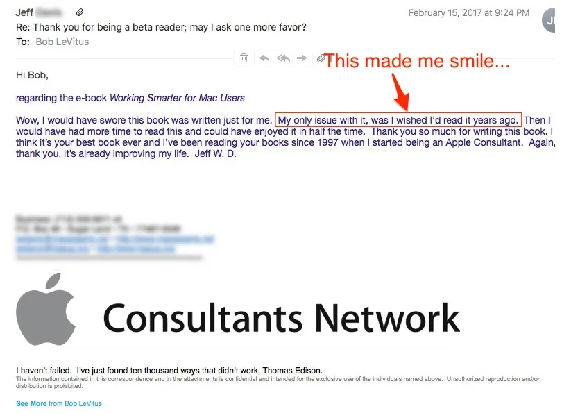 Its subject line is "Hey :)" and it's from bob@workingsmarterformacusers.com.